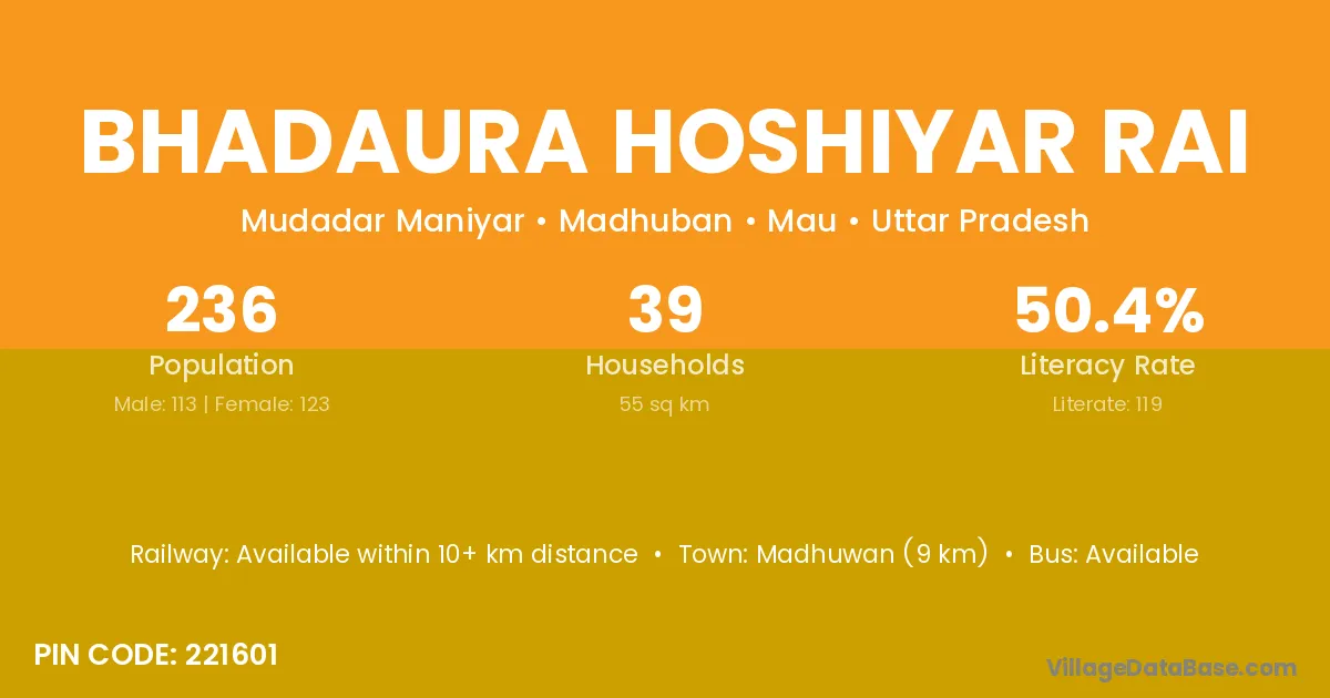 Madhuwan (9 km) is the nearest town to Bhadaura Hoshiyar Rai village for major economic activities and is located approximately 9 km away.