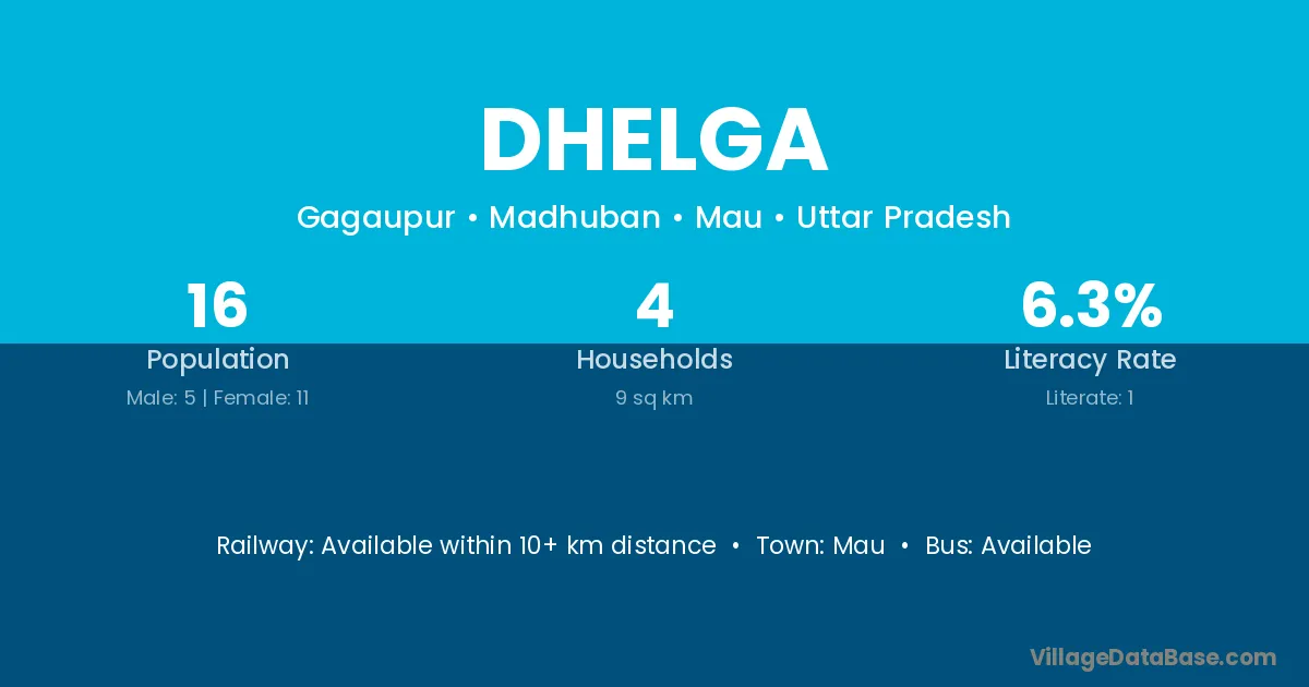 Dhelga village has a total population of 16 people, of which 5 are males and 11 are females.