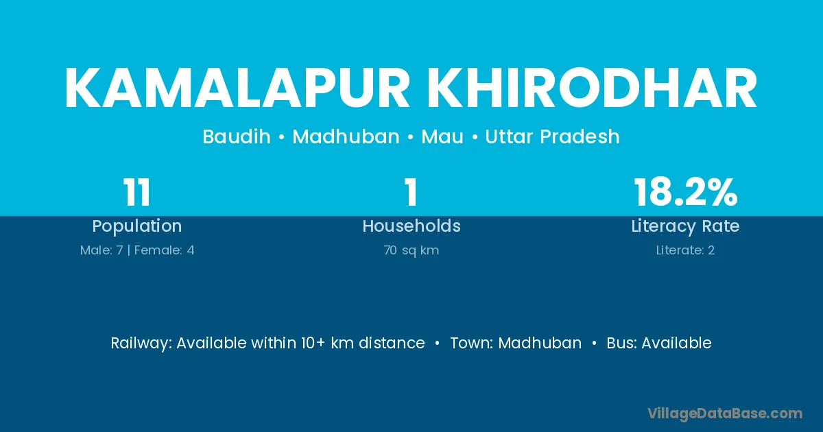 Kamalapur Khirodhar village has a total population of 11 people, of which 7 are males and 4 are females.