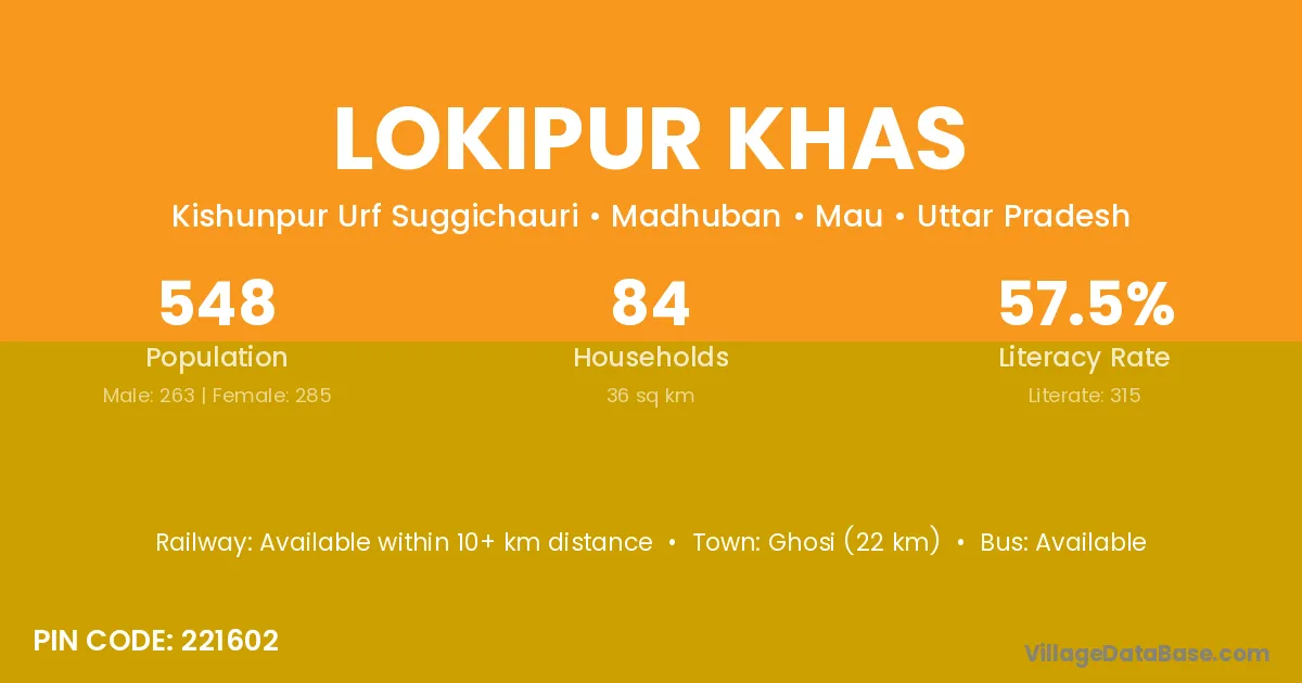 Ghosi (22 km) is the nearest town to Lokipur Khas village for major economic activities and is located approximately 22 km away.
