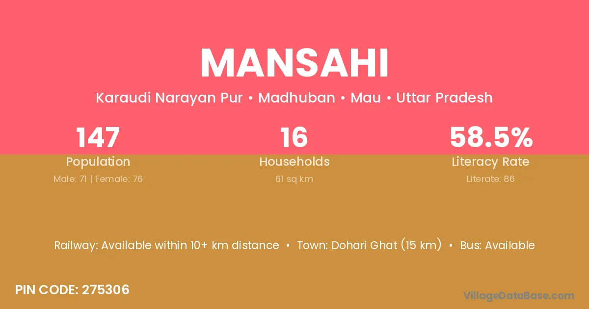 Mansahi village has a total population of 147 people, of which 71 are males and 76 are females.