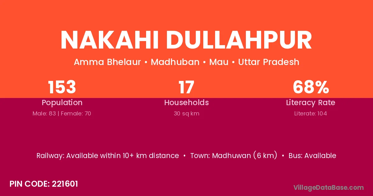 Nakahi Dullahpur village has a total population of 153 people, of which 83 are males and 70 are females.