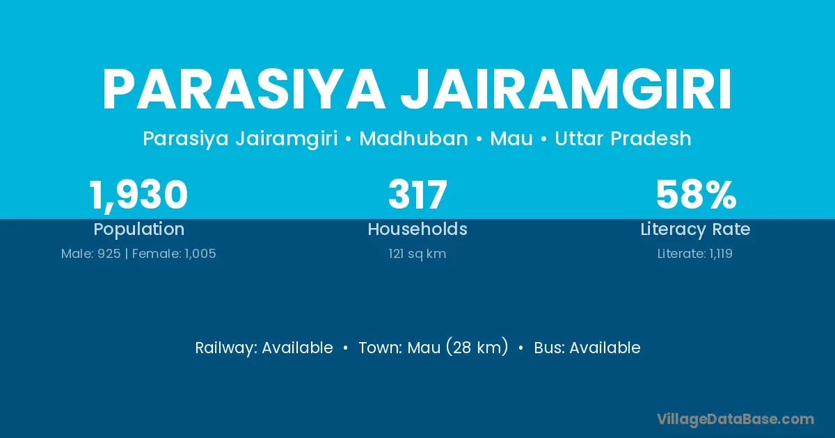 Mau (28 km) is the nearest town to Parasiya Jairamgiri village for major economic activities and is located approximately 28 km away.
