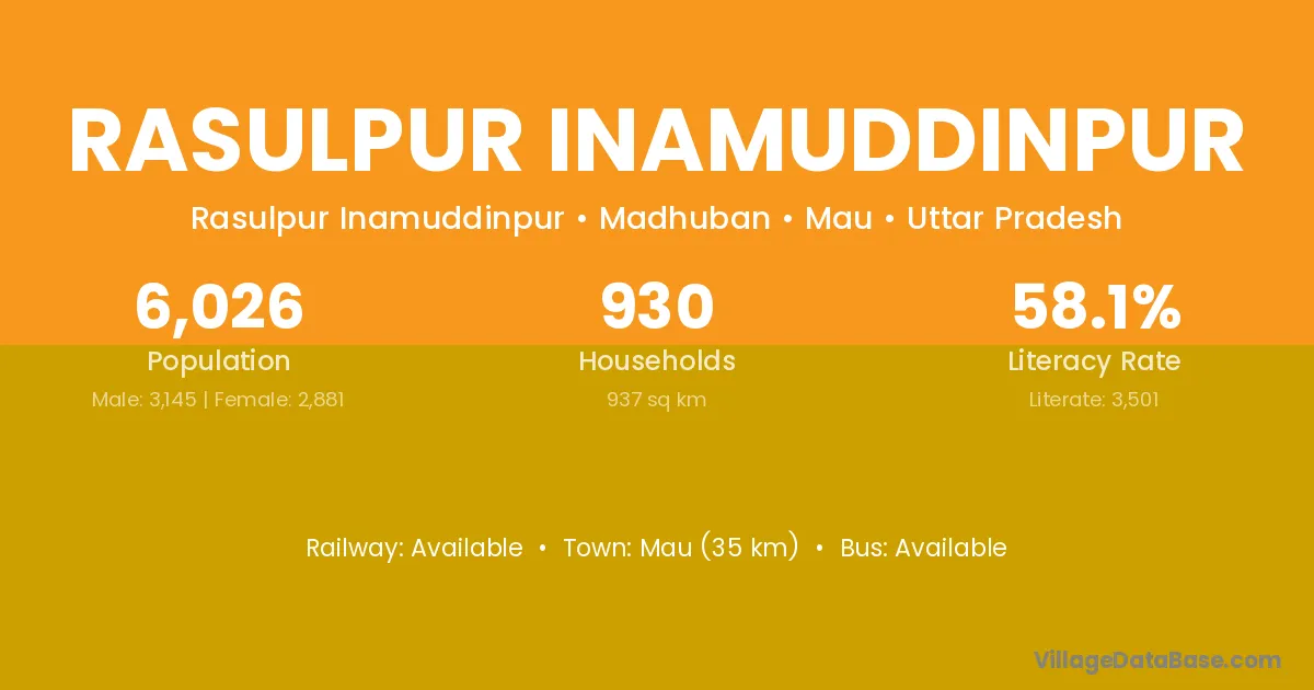 Mau (35 km) is the nearest town to Rasulpur Inamuddinpur village for major economic activities and is located approximately 35 km away.