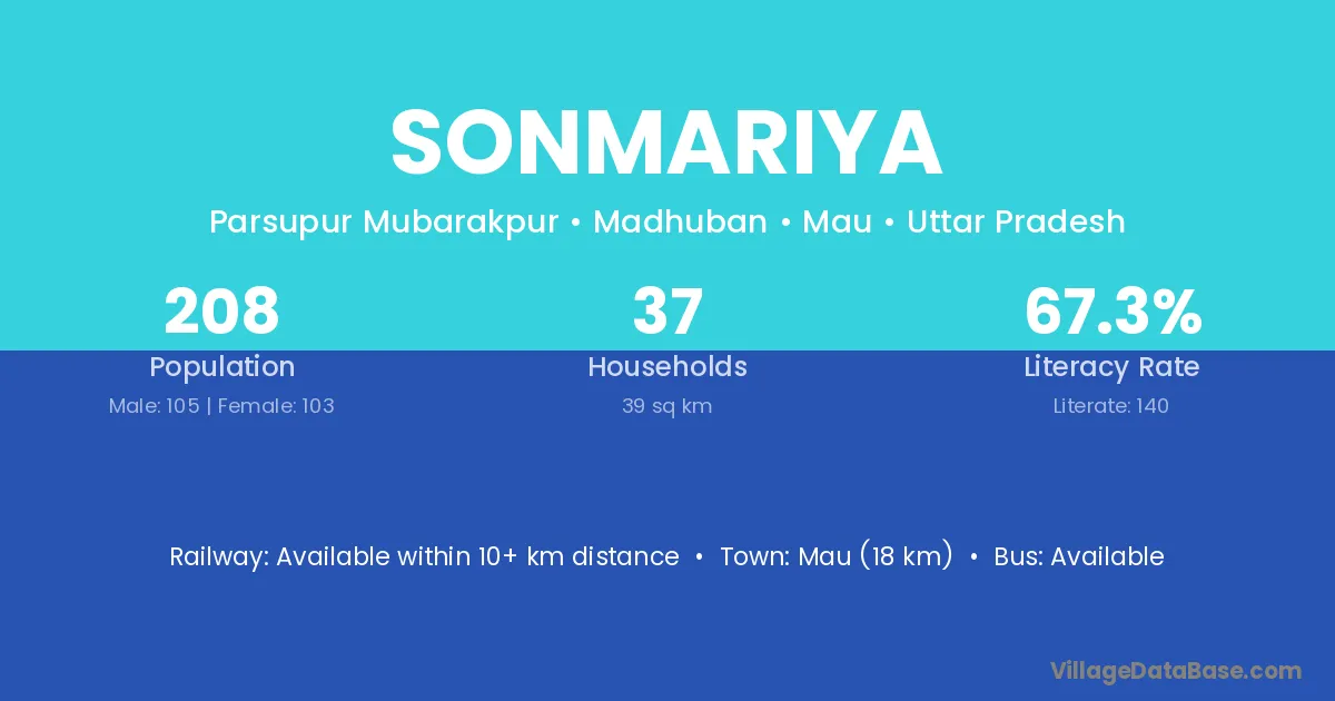 Mau (18 km) is the nearest town to Sonmariya village for major economic activities and is located approximately 18 km away.