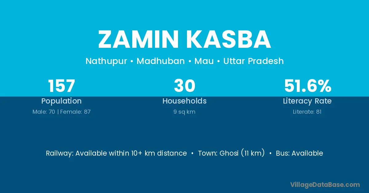 Ghosi (11 km) is the nearest town to Zamin Kasba village for major economic activities and is located approximately 11 km away.