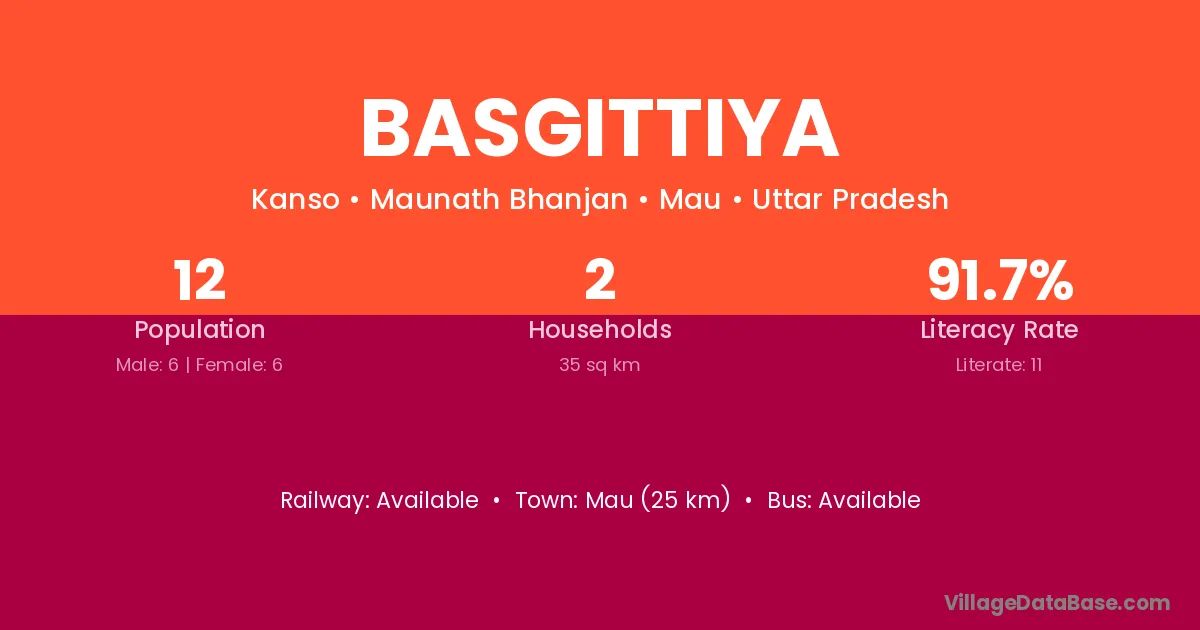 Mau (25 km) is the nearest town to Basgittiya village for major economic activities and is located approximately 25 km away.