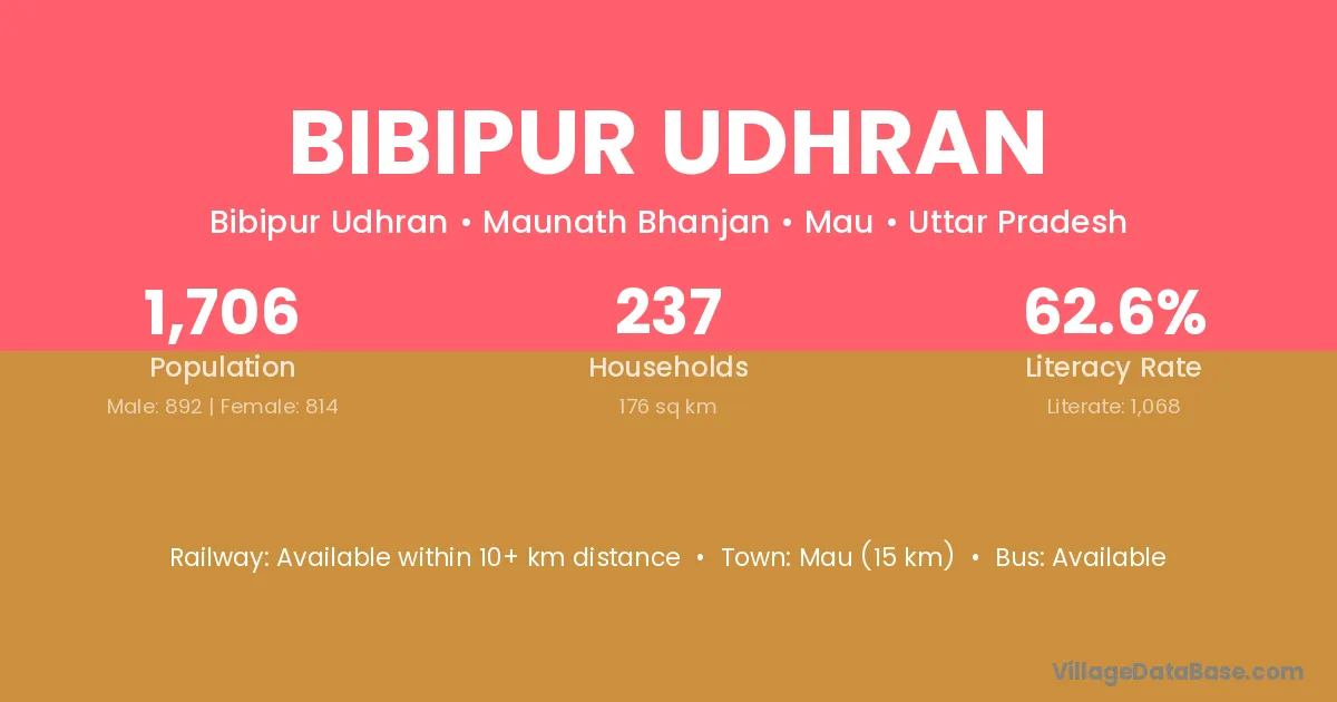 Mau (15 km) is the nearest town to Bibipur Udhran village for major economic activities and is located approximately 15 km away.