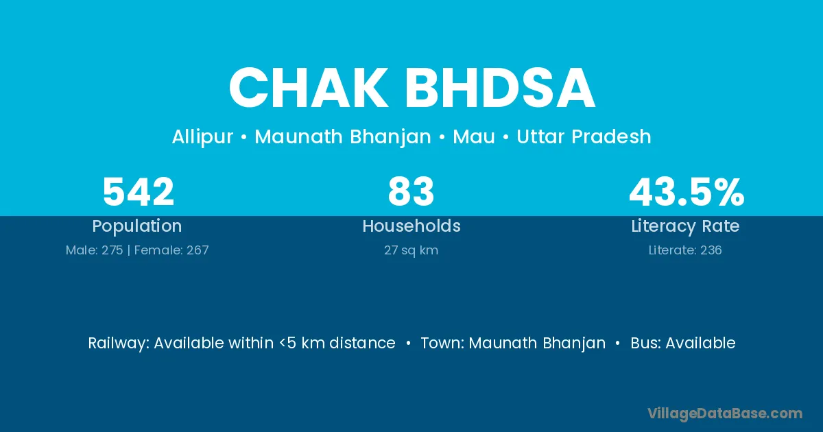 Maunath Bhanjan is the nearest town to Chak Bhdsa village for major economic activities