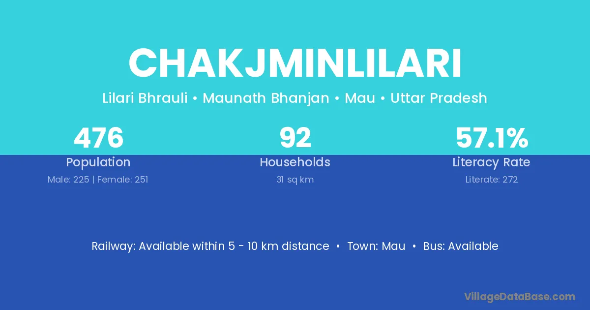 Chakjminlilari village has a total population of 476 people, of which 225 are males and 251 are females.