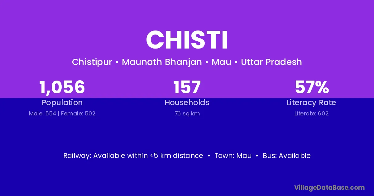 Chisti village has a total population of 1,056 people, of which 554 are males and 502 are females.