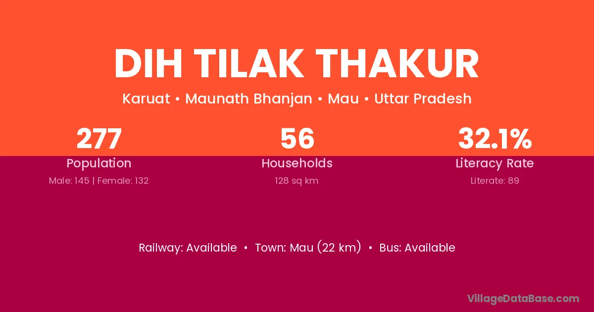 Mau (22 km) is the nearest town to Dih Tilak Thakur village for major economic activities and is located approximately 22 km away.