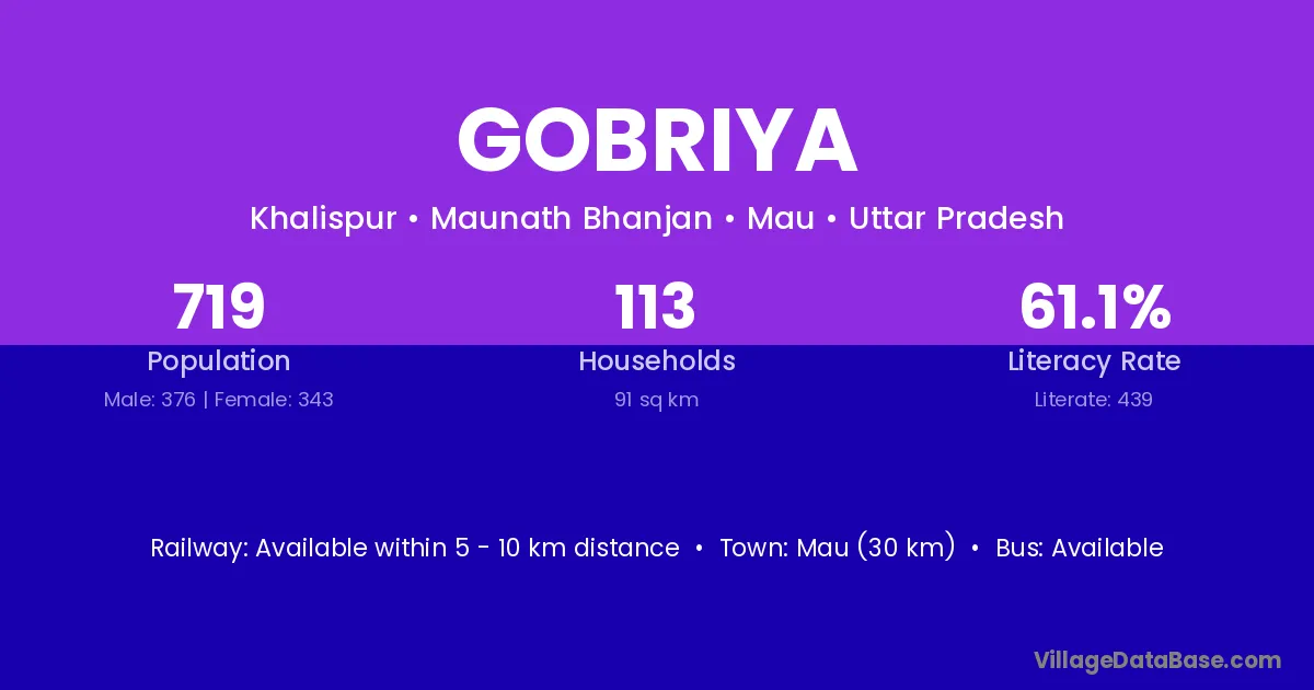 Mau (30 km) is the nearest town to Gobriya village for major economic activities and is located approximately 30 km away.