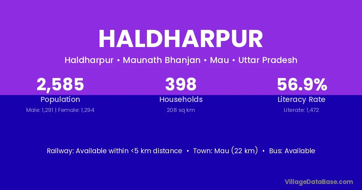 Mau (22 km) is the nearest town to Haldharpur village for major economic activities and is located approximately 22 km away.