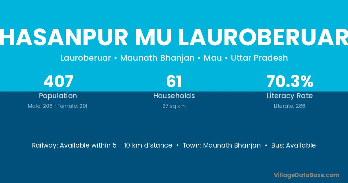 Hasanpur Mu Lauroberuar village has a total population of 407 people, of which 206 are males and 201 are females.
