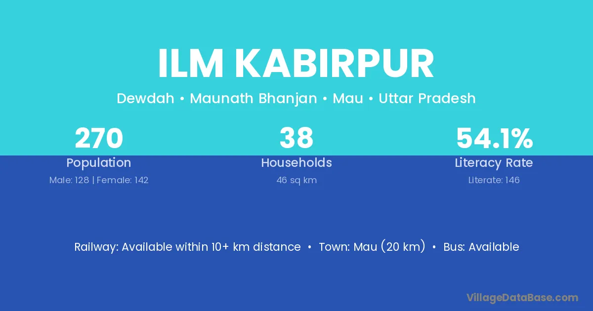 Mau (20 km) is the nearest town to Ilm Kabirpur village for major economic activities and is located approximately 20 km away.