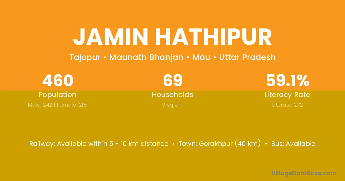 Gorakhpur (40 km) is the nearest town to Jamin Hathipur village for major economic activities and is located approximately 40 km away.