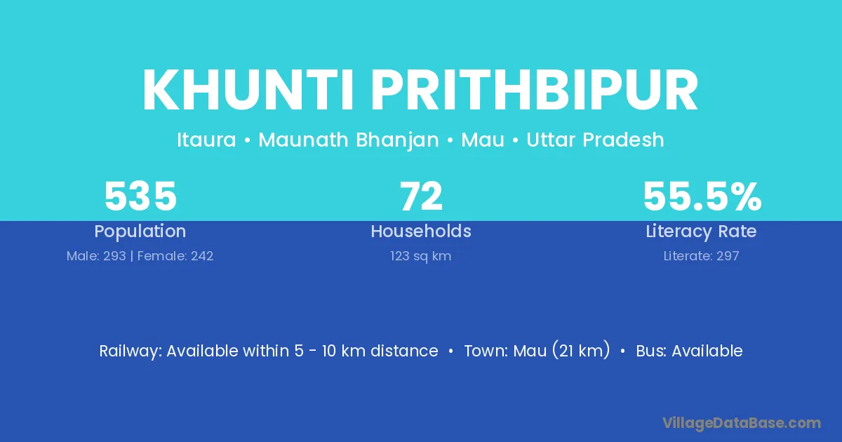 Mau (21 km) is the nearest town to Khunti Prithbipur village for major economic activities and is located approximately 21 km away.