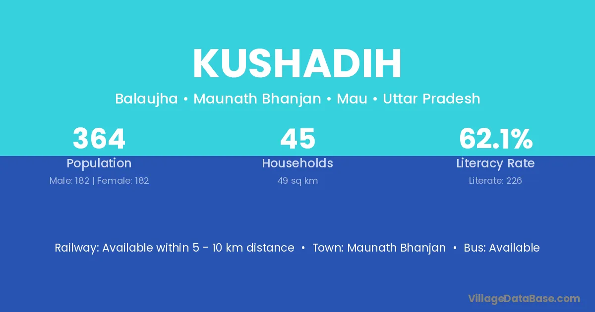 Kushadih village has a total population of 364 people, of which 182 are males and 182 are females.