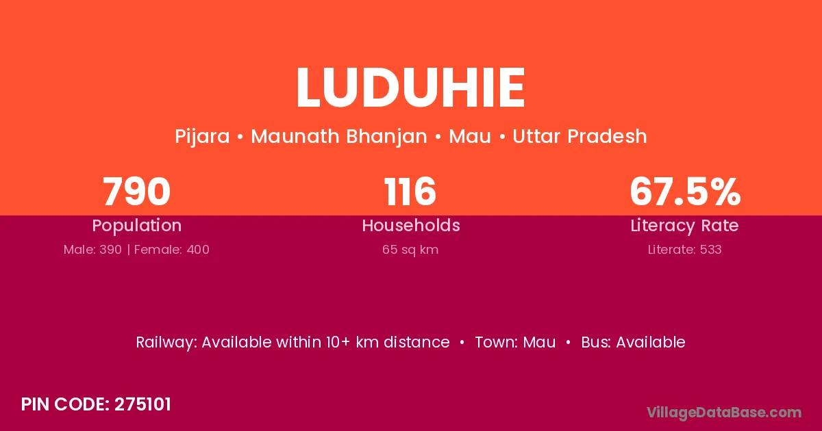 Luduhie village has a total population of 790 people, of which 390 are males and 400 are females.