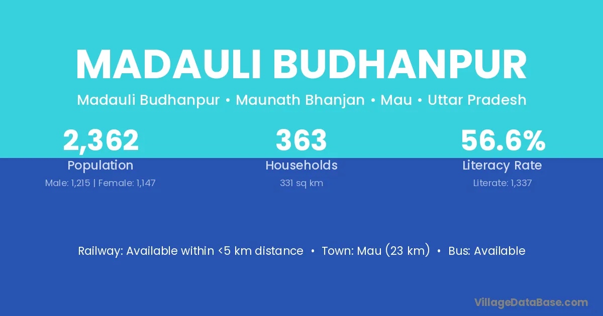Mau (23 km) is the nearest town to Madauli Budhanpur village for major economic activities and is located approximately 23 km away.