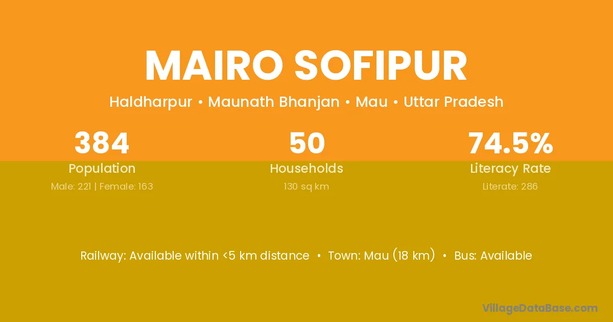Mau (18 km) is the nearest town to Mairo Sofipur village for major economic activities and is located approximately 18 km away.