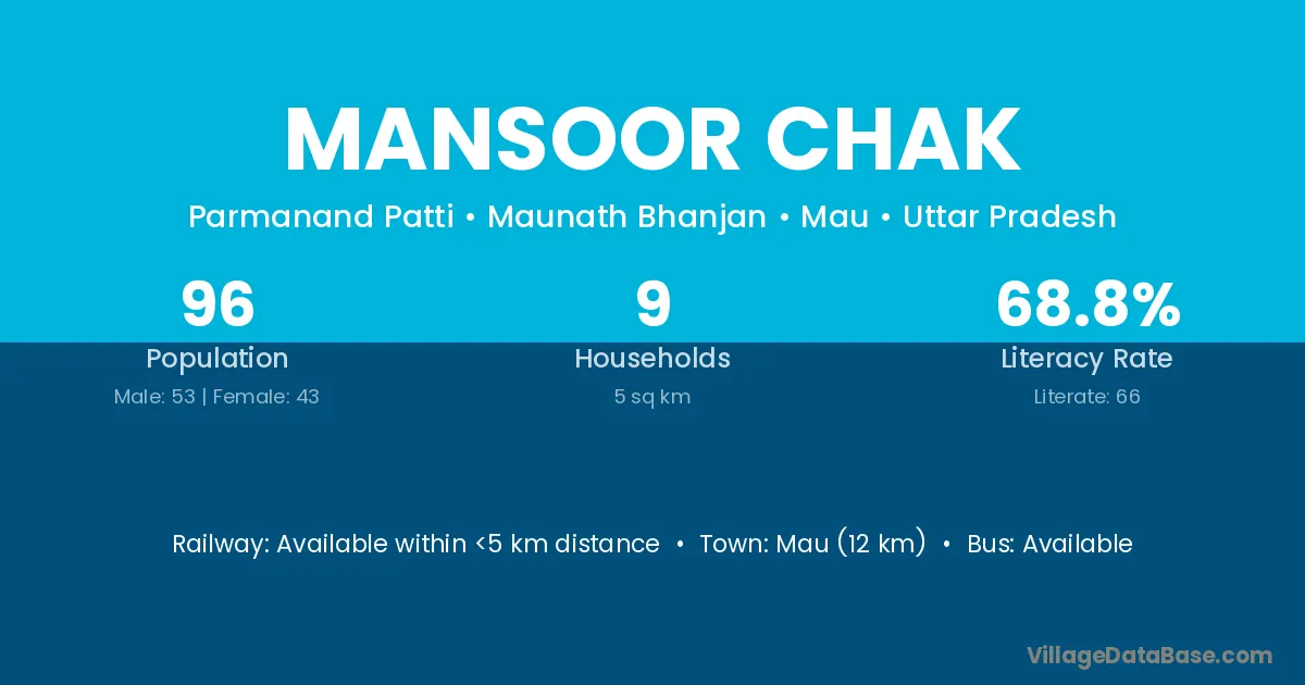 Mau (12 km) is the nearest town to Mansoor Chak village for major economic activities and is located approximately 12 km away.