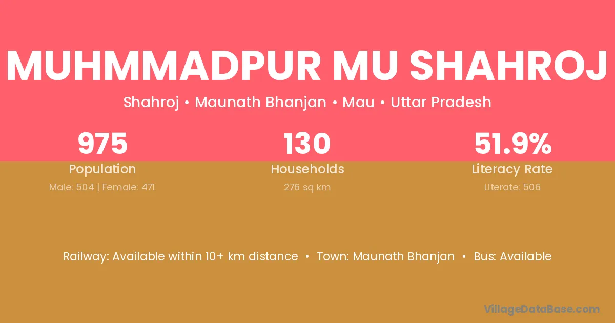 Muhmmadpur Mu Shahroj village has a total population of 975 people, of which 504 are males and 471 are females.