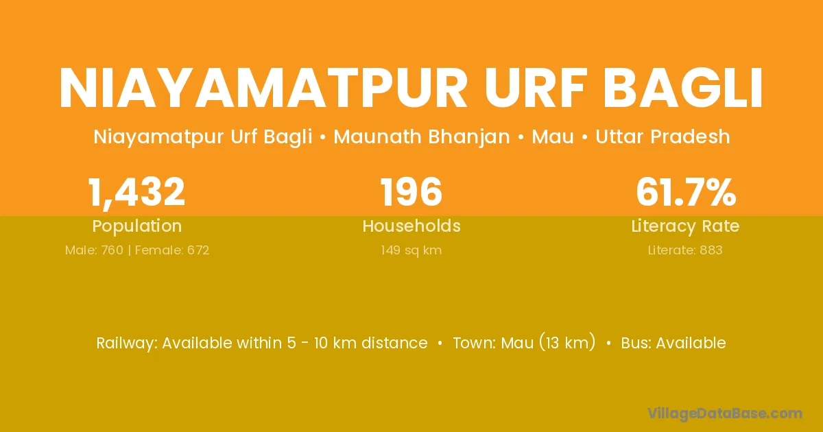 Niayamatpur Urf Bagli village has a total population of 1,432 people, of which 760 are males and 672 are females.