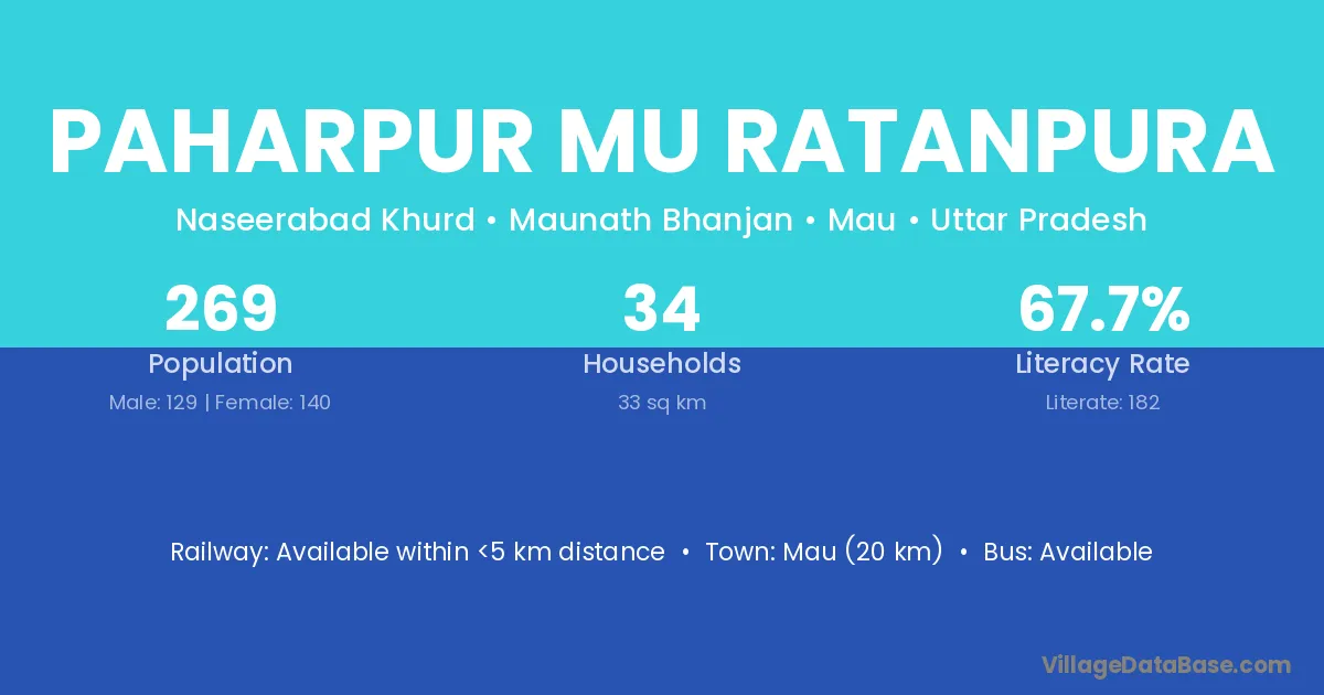 Mau (20 km) is the nearest town to Paharpur Mu Ratanpura village for major economic activities and is located approximately 20 km away.