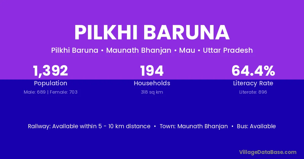 Maunath Bhanjan is the nearest town to Pilkhi Baruna village for major economic activities