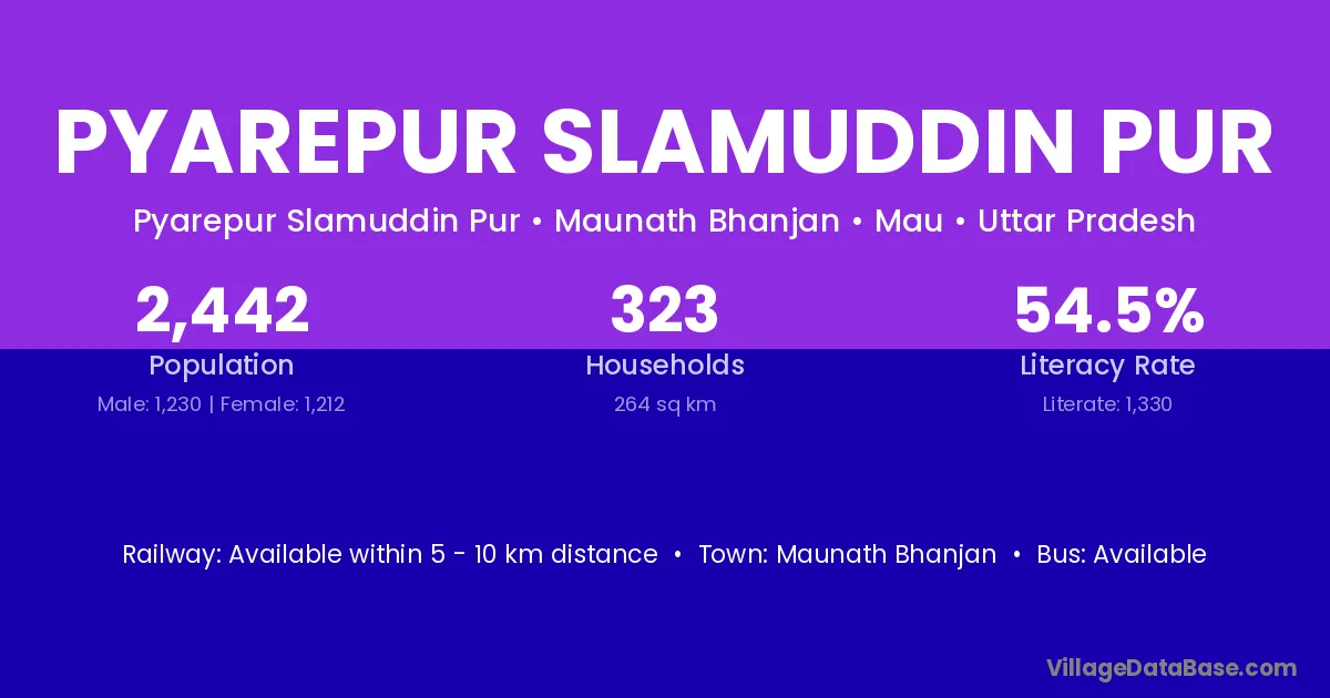 Maunath Bhanjan is the nearest town to Pyarepur Slamuddin Pur village for major economic activities