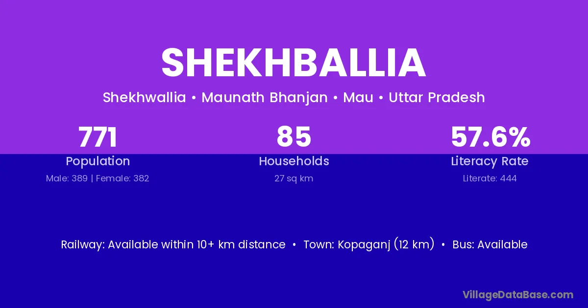 Shekhballia village has a total population of 771 people, of which 389 are males and 382 are females.