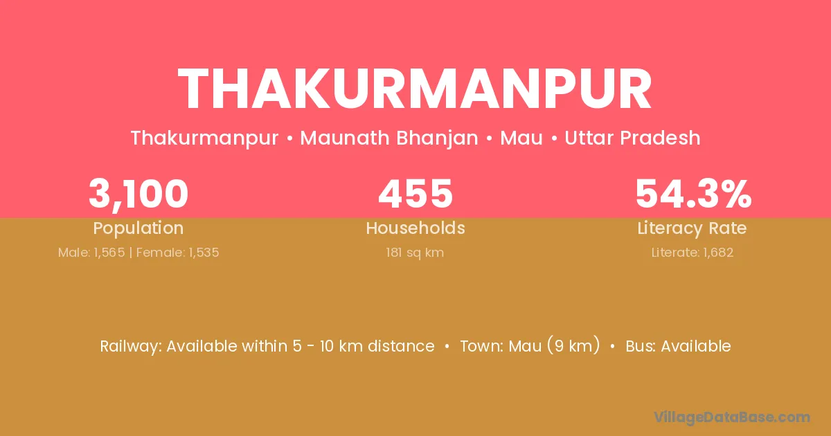 Mau (9 km) is the nearest town to Thakurmanpur village for major economic activities and is located approximately 9 km away.