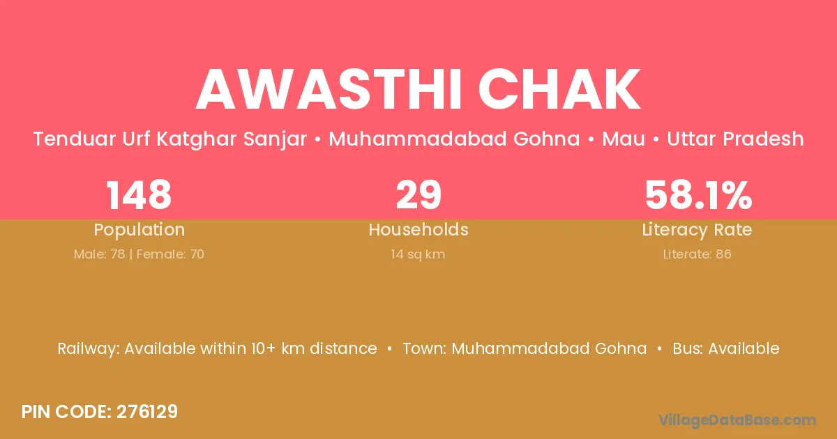 Awasthi Chak village has a total population of 148 people, of which 78 are males and 70 are females.