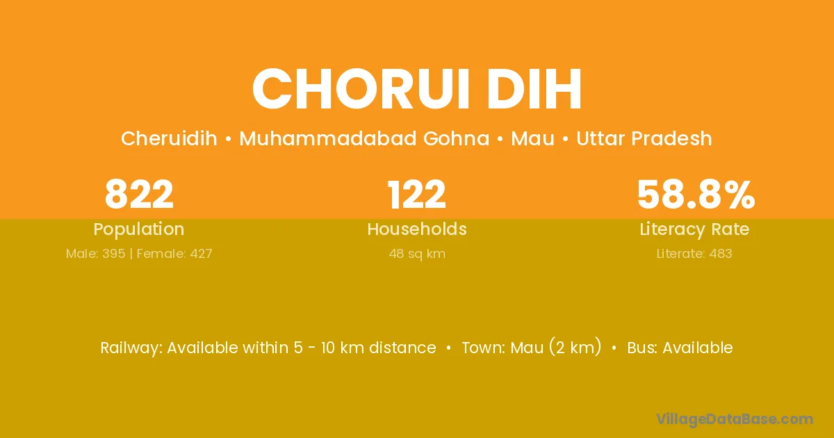 Mau (2 km) is the nearest town to Chorui Dih village for major economic activities and is located approximately 2 km away.