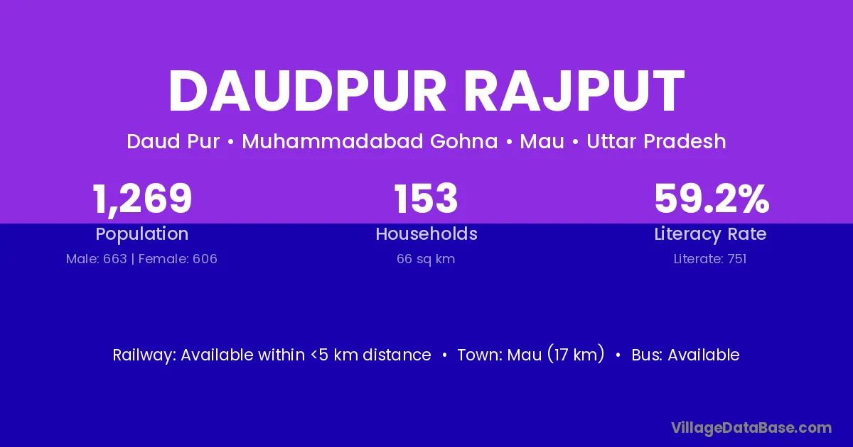 Mau (17 km) is the nearest town to Daudpur Rajput village for major economic activities and is located approximately 17 km away.