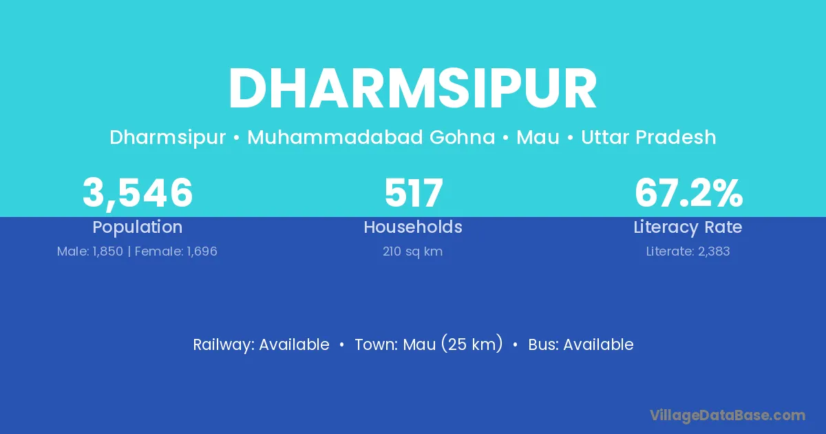 Mau (25 km) is the nearest town to Dharmsipur village for major economic activities and is located approximately 25 km away.