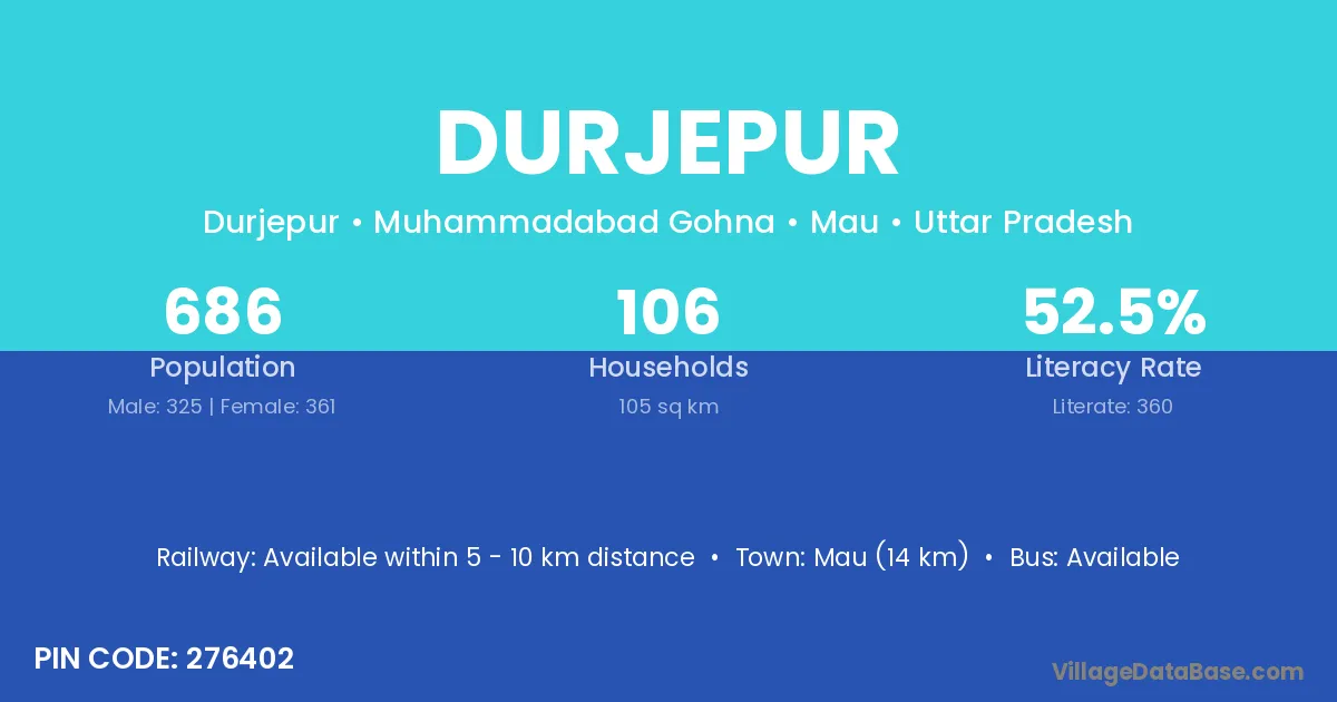 Mau (14 km) is the nearest town to Durjepur village for major economic activities and is located approximately 14 km away.