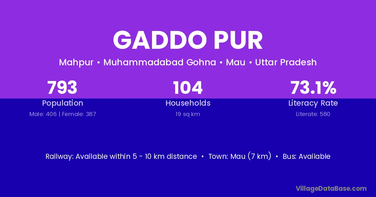 Mau (7 km) is the nearest town to Gaddo Pur village for major economic activities and is located approximately 7 km away.