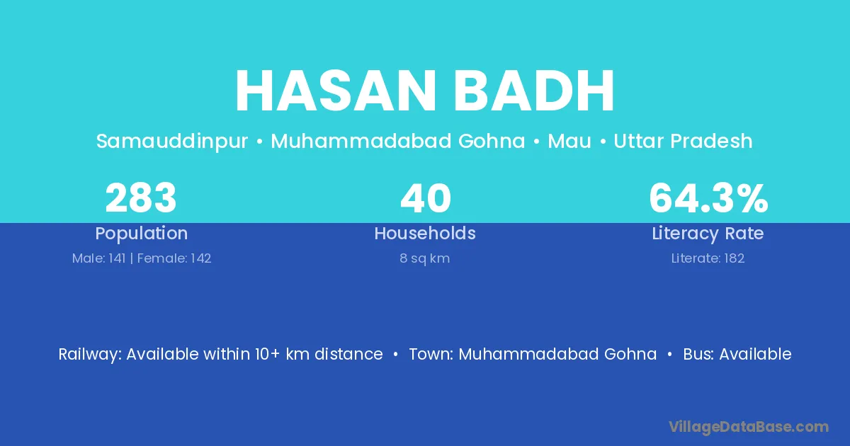 Hasan Badh village has a total population of 283 people, of which 141 are males and 142 are females.