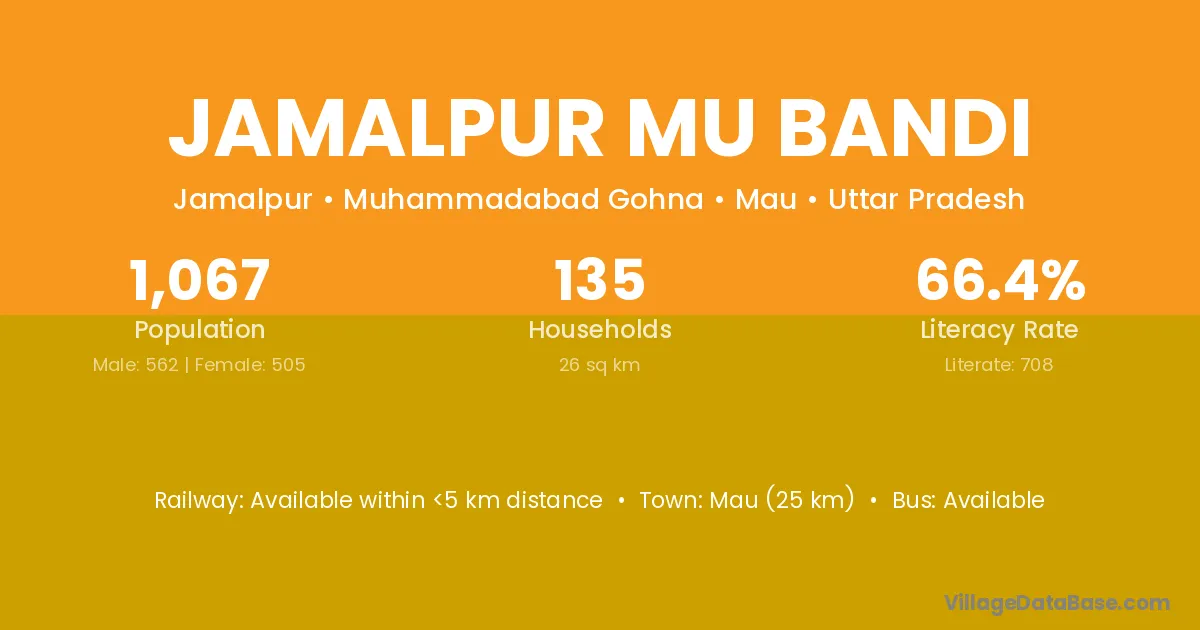 Mau (25 km) is the nearest town to Jamalpur Mu Bandi village for major economic activities and is located approximately 25 km away.