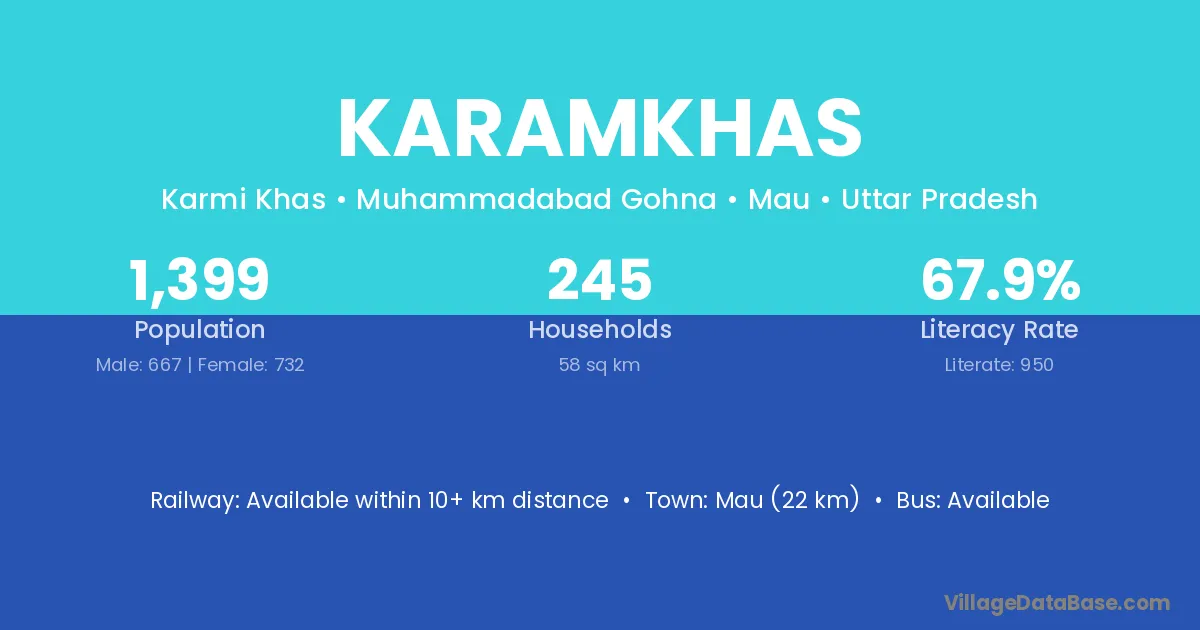 Mau (22 km) is the nearest town to Karamkhas village for major economic activities and is located approximately 22 km away.