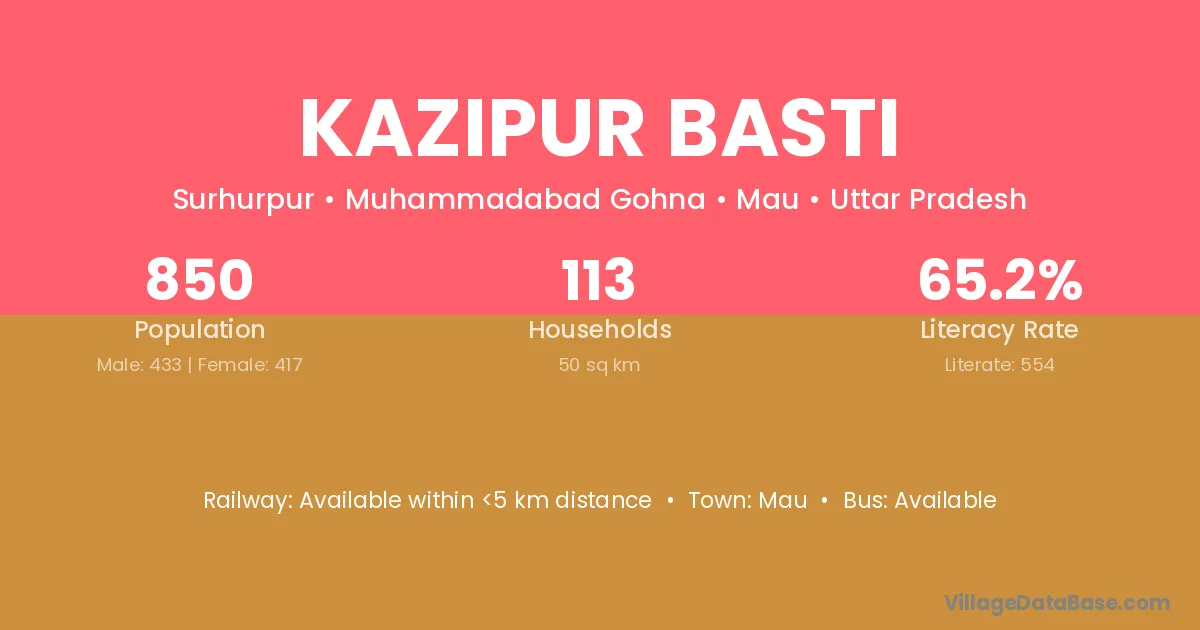 Kazipur Basti village has a total population of 850 people, of which 433 are males and 417 are females.