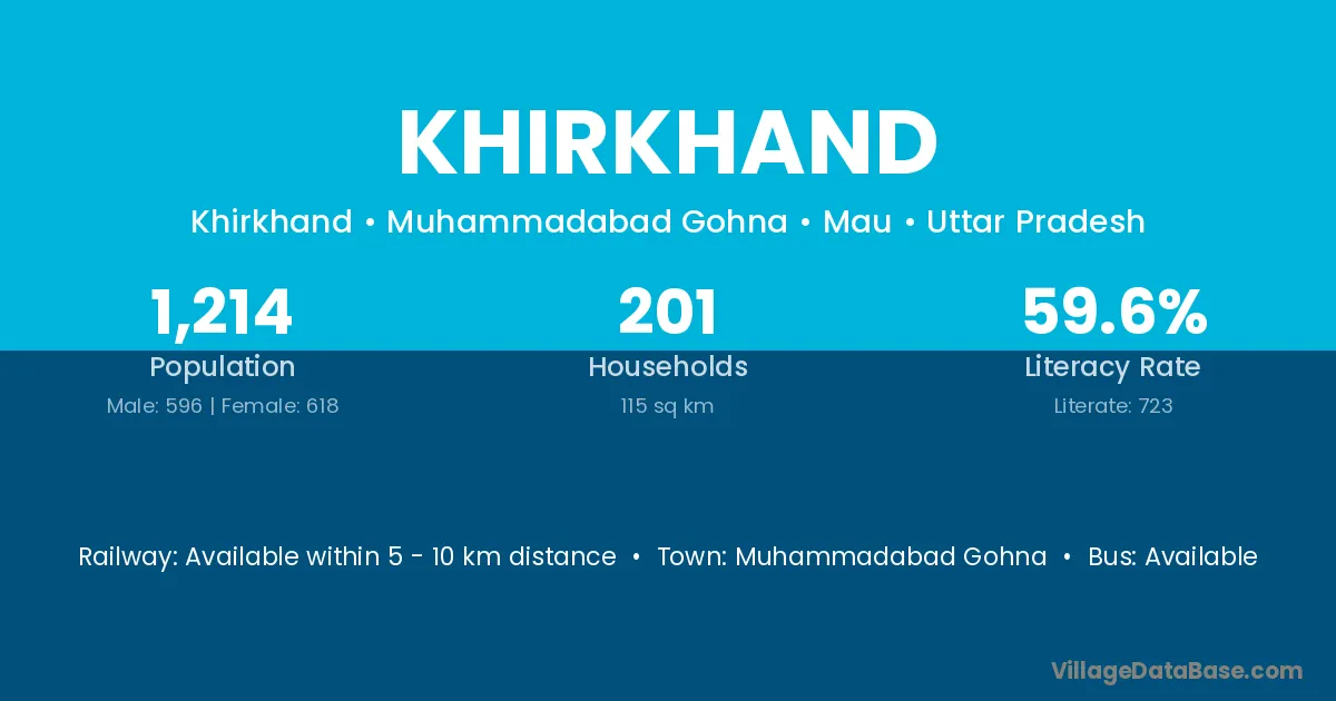 Khirkhand village has a total population of 1,214 people, of which 596 are males and 618 are females.