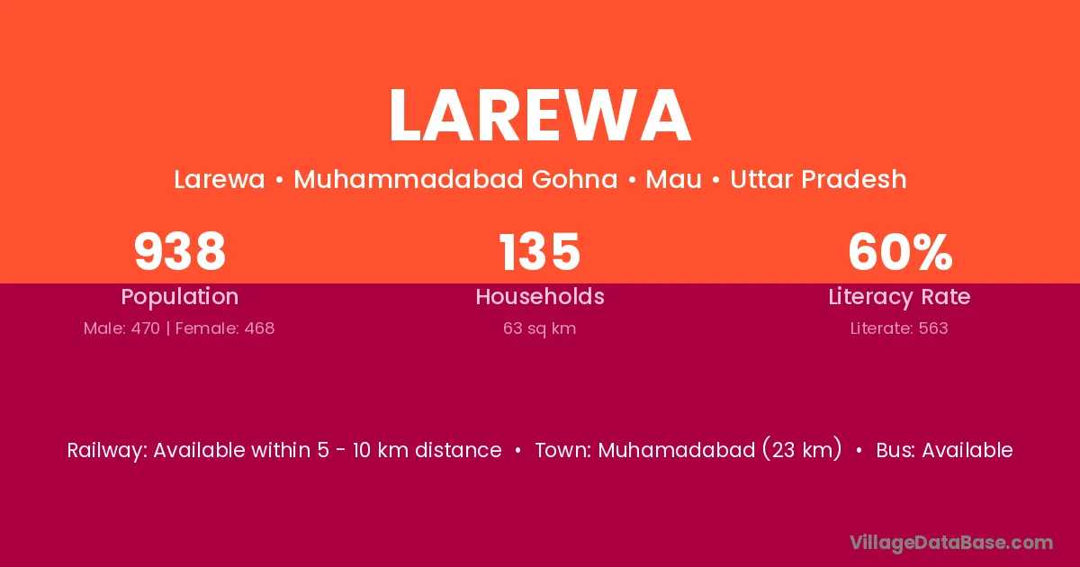 Muhamadabad (23 km) is the nearest town to Larewa village for major economic activities and is located approximately 23 km away.
