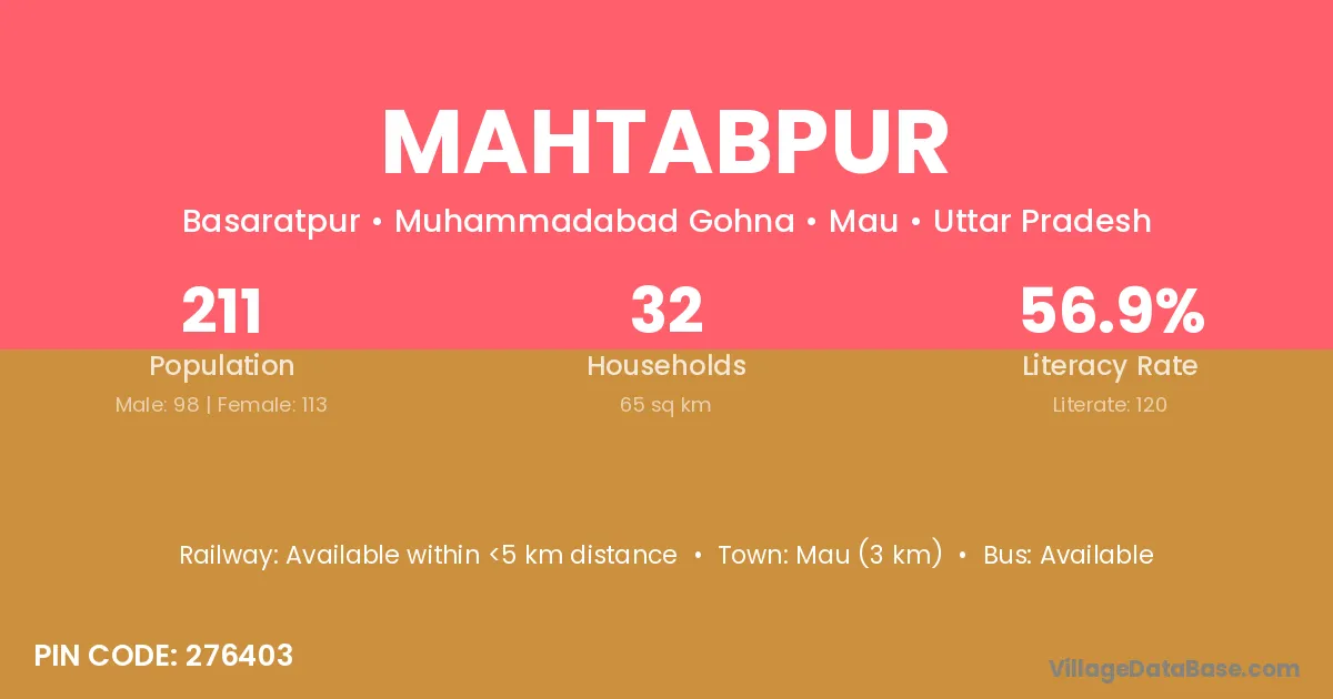 Mau (3 km) is the nearest town to Mahtabpur village for major economic activities and is located approximately 3 km away.