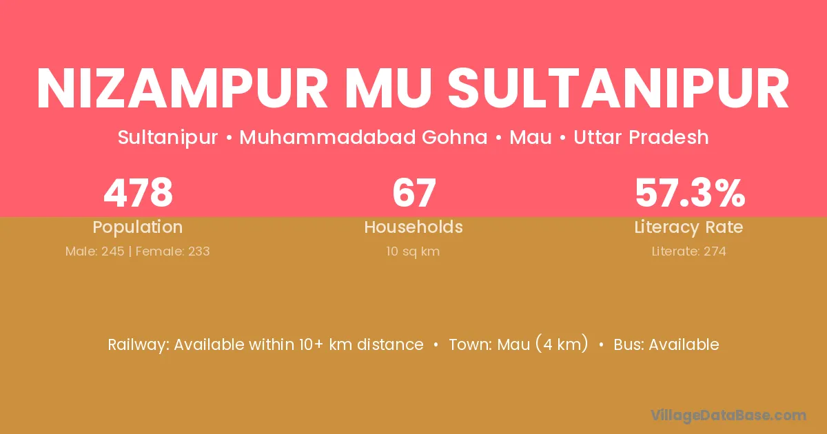 Mau (4 km) is the nearest town to Nizampur Mu Sultanipur village for major economic activities and is located approximately 4 km away.