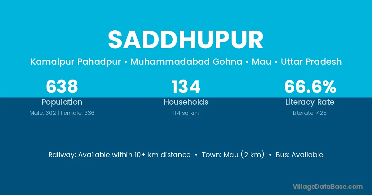Mau (2 km) is the nearest town to Saddhupur village for major economic activities and is located approximately 2 km away.