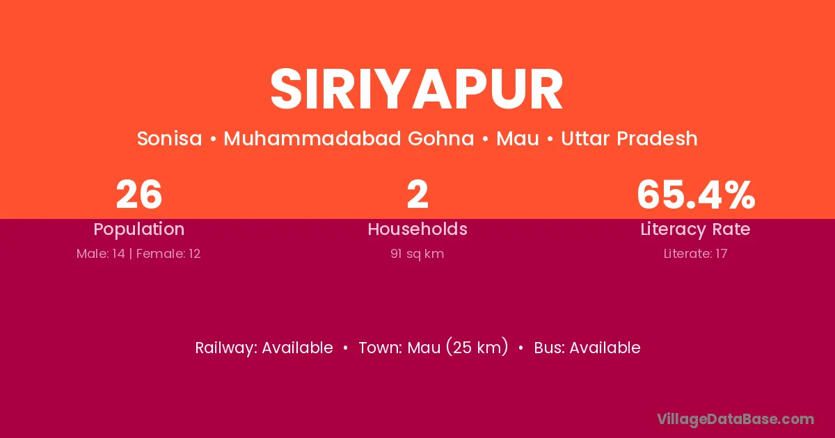 Mau (25 km) is the nearest town to Siriyapur village for major economic activities and is located approximately 25 km away.